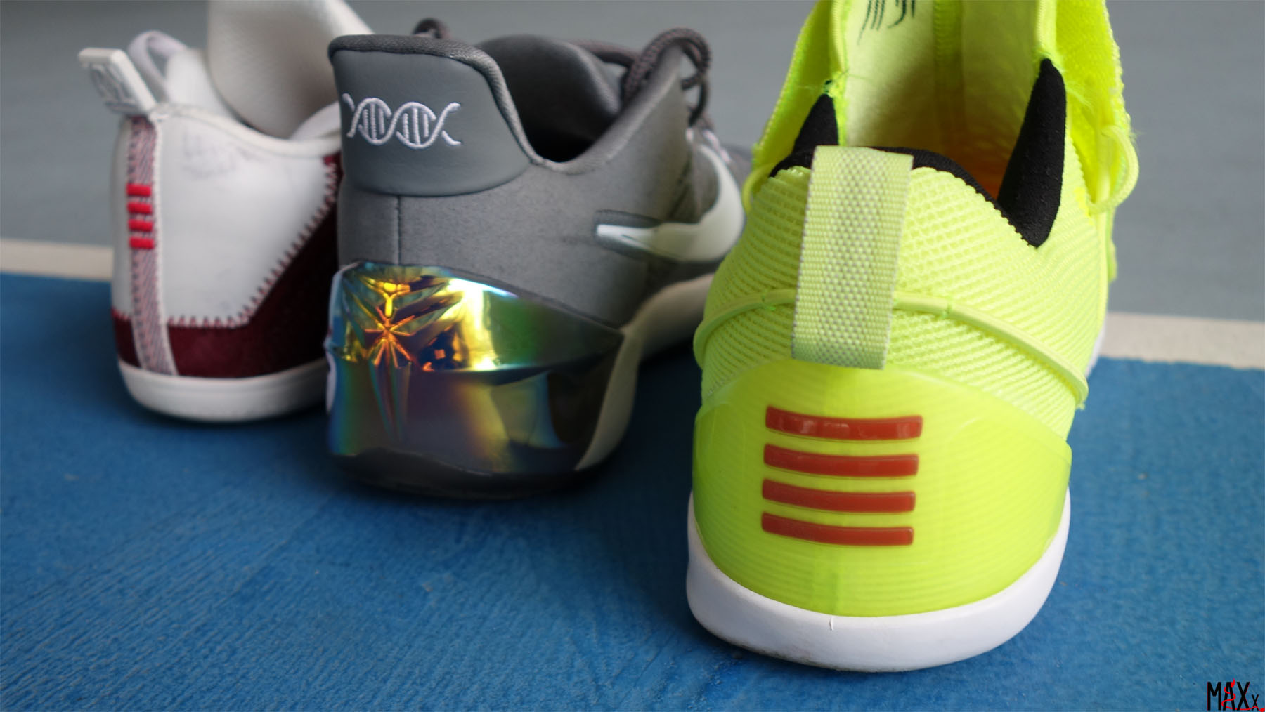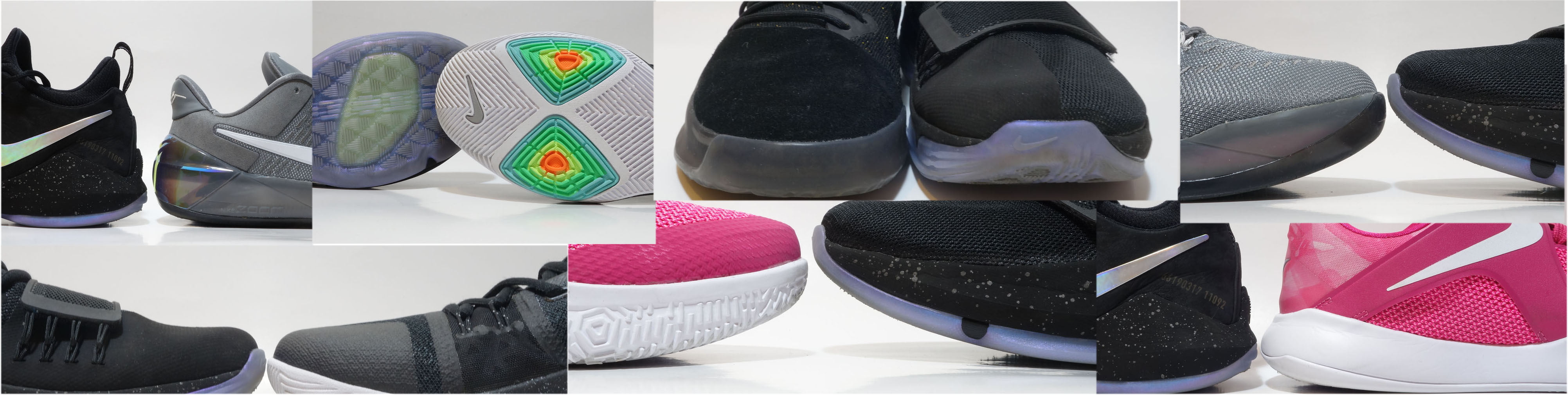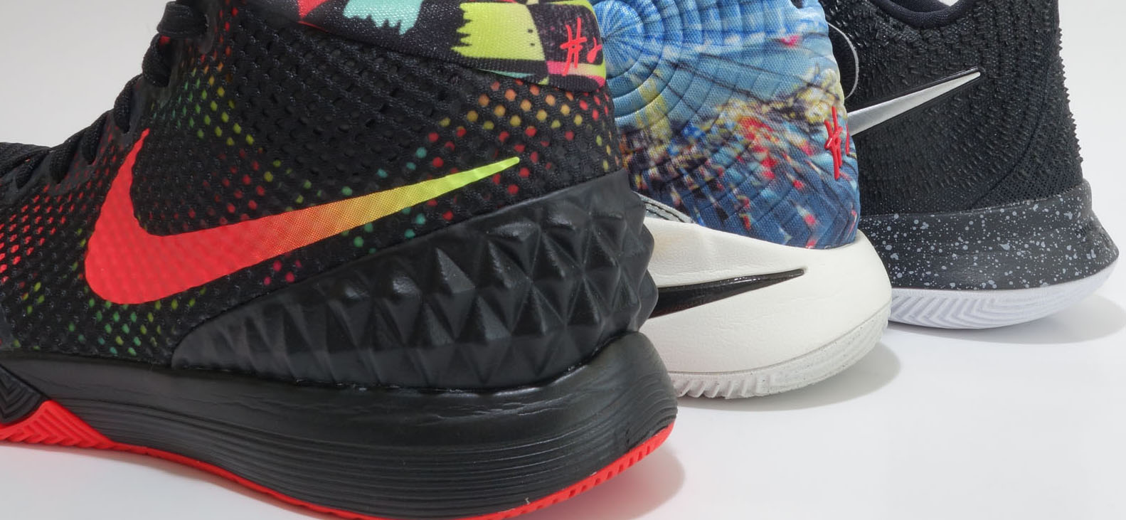 KYRIE 系列已經推出至第三代, 大家對KYRIE 的注目度主要集中三代相互比較; 假如將這三代KYRIE進行分析, 究竟有甚麼改變? (KYRIE 1-3 由上至下排序) 首先從鞋面物料開始, KYRIE 1 整幅鞋面使用Hyperfuse, 鞋面所使用的技術是三對中最少, 較特別是鞋跟帶尖角的穏定設計。 KYRIE 2 鞋面最突出設計是中足上的魔術貼綁帶, 由外向內綁並將鞋身分配成前後兩部分, 鞋頭至中足使用Hyperfuse,